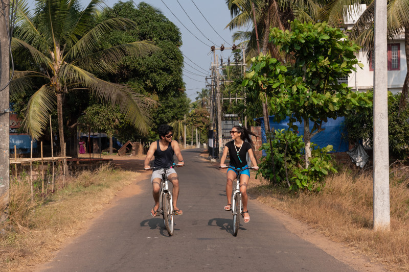 Etter en salig ajurvedisk behandling, er jeg smått i ørska når vi sykler ut av resorten for å sjekke ut nabolaget. Vi er på landsbygda. Hit og dit. Små veier. Landsbyer. Alle hilser. Grønt og frodig. Blomster. Fargerikt. Tett på. Godt å være. Og … det er som å spole tiden tilbake mange, mange år.