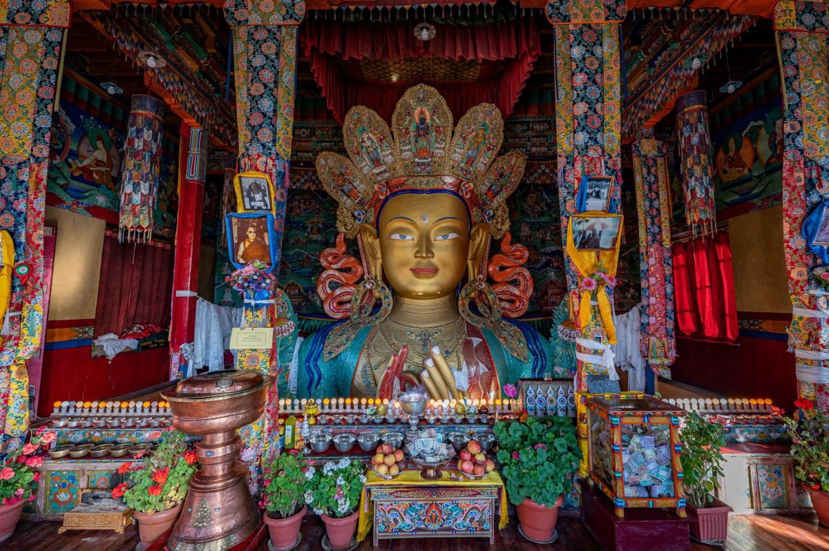 Her er kalkhvite bygg med gullstupaer og røde tak. Bønnehjul og bønnesteiner. Enkelt på utsiden. Langt mer fargerikt på innsiden av templene som hører til klosterkomplekset.