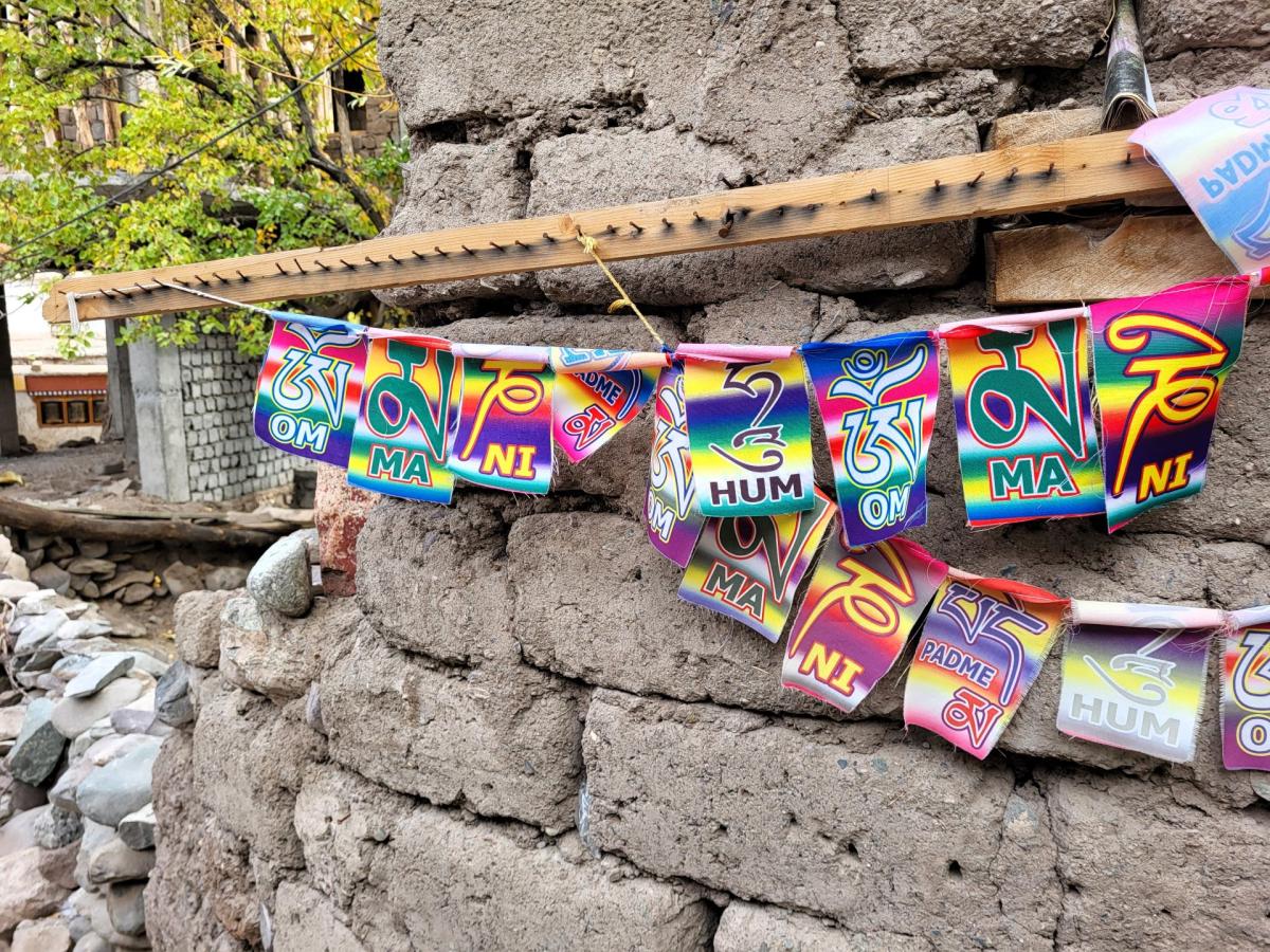 Vi rusler innover mot fjellene. Jeg får stølsfølelse av å gå her. Litt Gauklia i Valdres med besteforeldrene mine på 70-tallet. Noen spredte hus hist og her. Så setter vi kurs mot et av husene. Dette huset, som alle andre hus her i Ladakh, har de karakteristiske treutskjæringene rundt inngangspartiet og vinder. Husker jeg ikke feil, så er det obligatorisk å utsmykke husene slik på tradisjonelt vis. Og på taket har familien bønneflagg. Grønt, gult, blått, hvitt og rødt. For balanse. For beskyttelse.