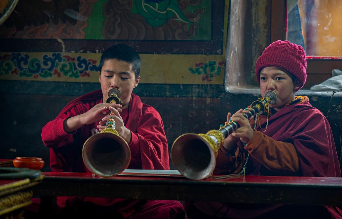 Det er chanting. Det er kostymer. Det er farger. Sterke farger. Det er dans og musikk – og det er munkene som står for utførelsen. Det er fascinerende å være tilskuer. Jeg blir revet med i de taktfaste rytmene der det danses i ring med 20-30 munker. Over oss er himmelen blå og fjellene med hvite sukkertopper omkranser oss. Det er veldig nært at jeg må kalle det en spirituell opplevelse.