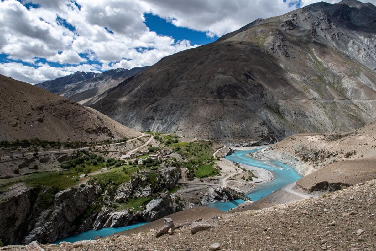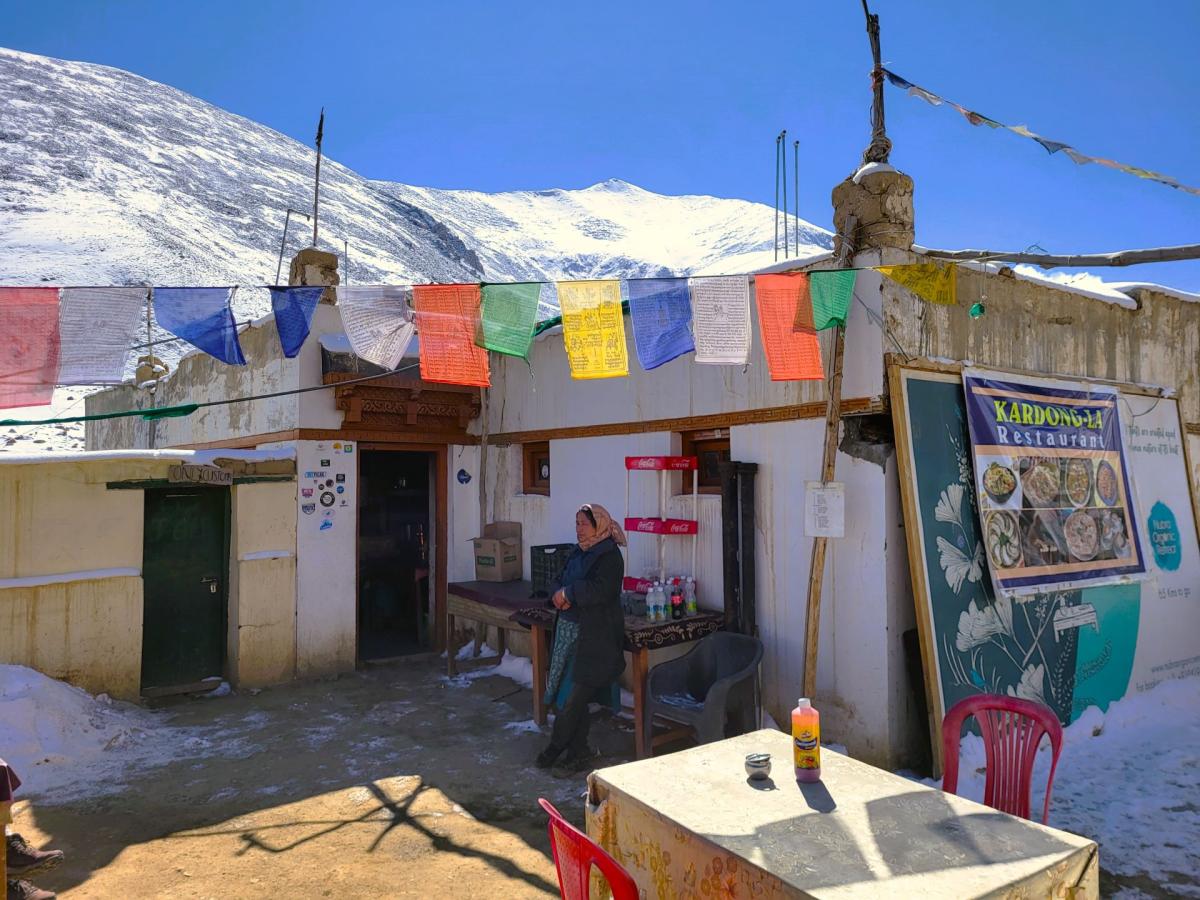 På vei ned stopper vi i landsbyen som heter Khardung. Den ligger i «lavlandet» på 4000 moh. Her er det toalett- og testopp. Jeg geleides av en blid, gammel dame (hun som senere skal servere meg nydelig te) gjennom kafeen hennes og ut bakdøren. Ut i friluft. Jeg ser sannsynligvis ut som et spørsmålstegn. Hun gestikulerer og peker. Jeg finner til slutt ut at toalettet for vannlating er bak en uthusvegg. Jeg kjenner på lukta at jeg ikke er førstemann til å benytte fasilitetene. Jeg flirer der jeg sitter med den vakreste utsikten fra en utedo jeg noen gang har opplevd. Det er en så bra opplevelse at jeg kommer på do- og tebesøk noen dager senere også …