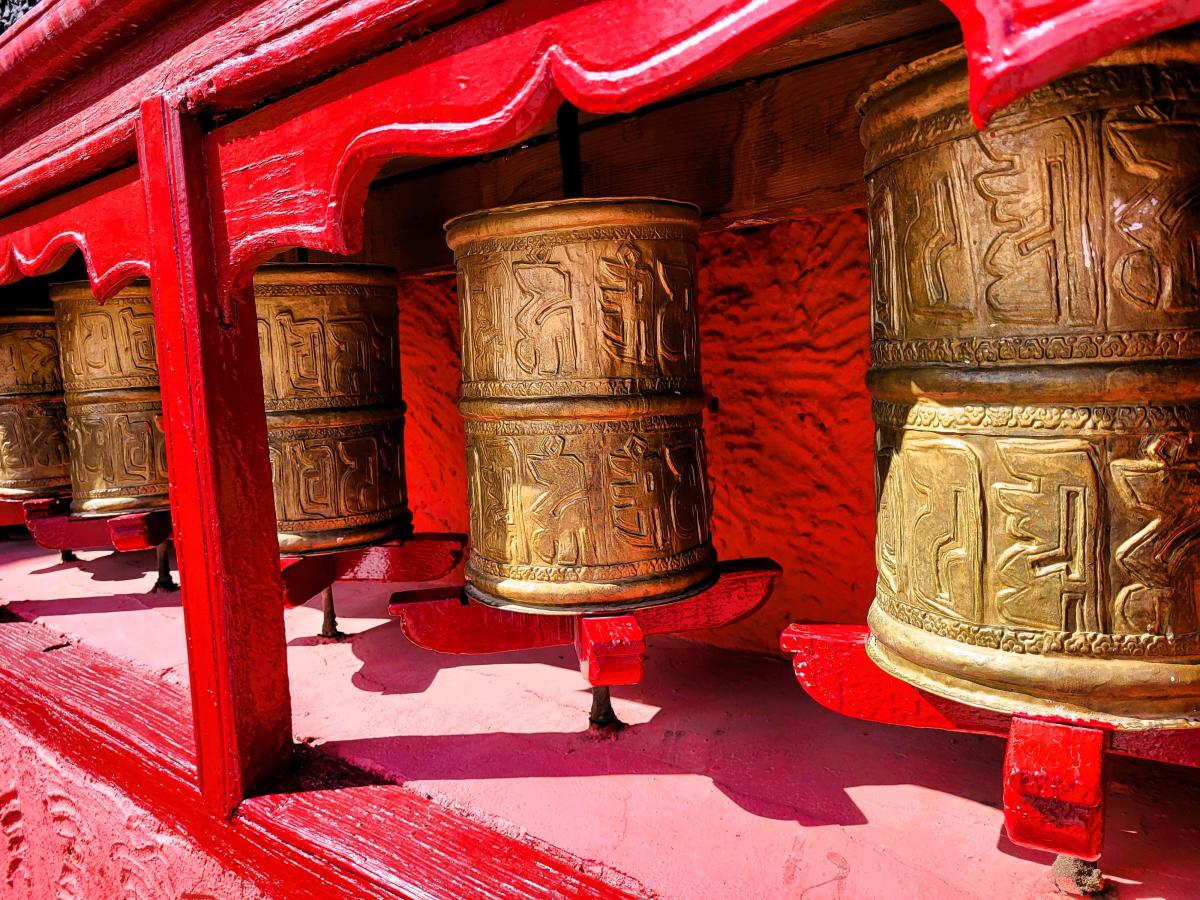 Gedigne bønnehjul møter oss etter at vi har gått gjennom hovedporten. Rød med gulldekorasjon og med dramatiske, snøkledde fjell som bakgrunnsmotiv idet jeg snurrer hjulet i gang.