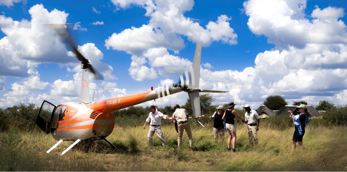 Transporten videre går først med bil til Khwai Airstrip (20 minutter), deretter blir det vel en times fantastisk helikoptertur til Kalahariørkenen og Feline Fields Lodge.