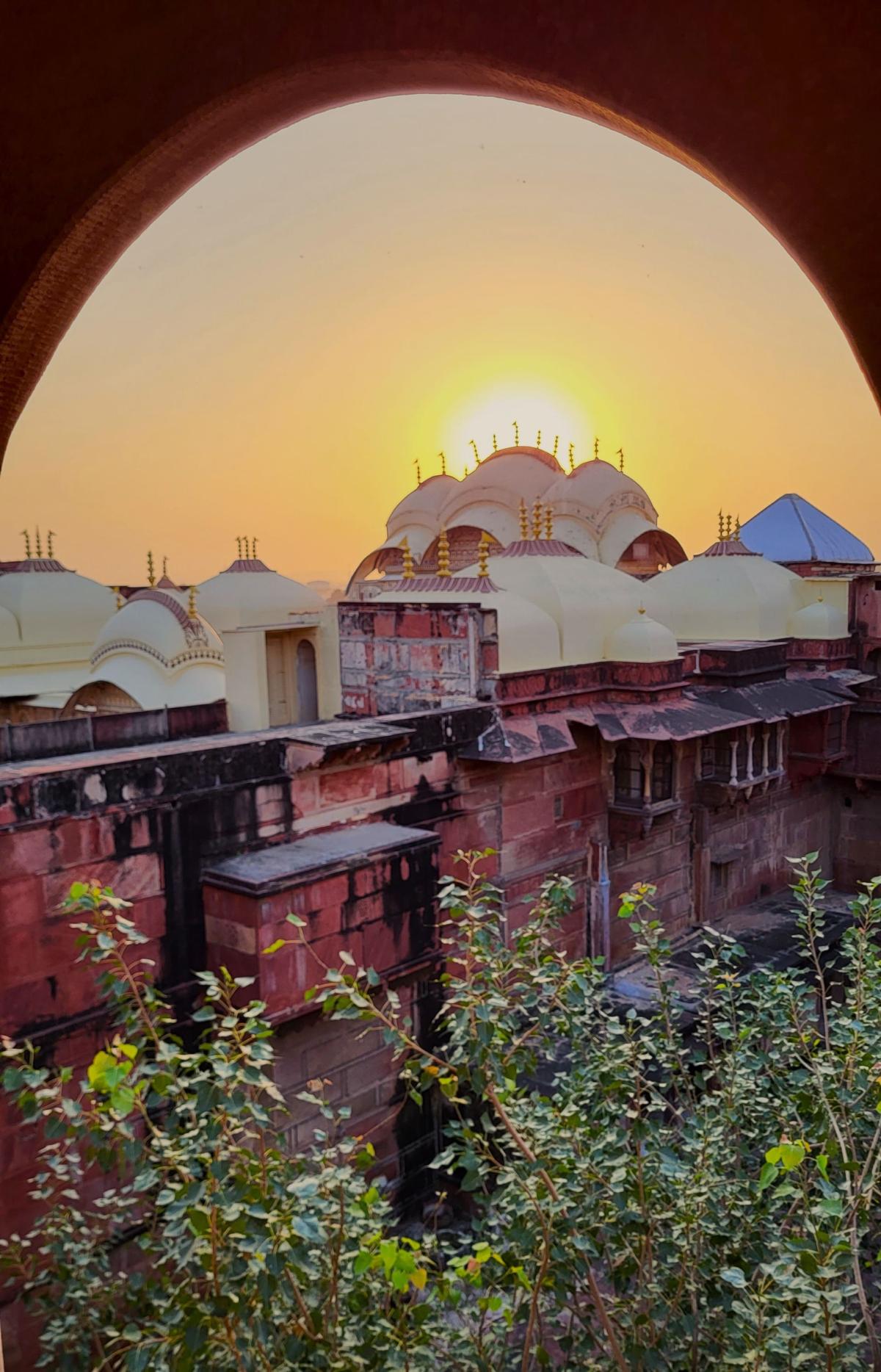 Bortover en gang. Opp en trapp. To trapper. Dekorerte vegger og tak rundt baut. Vi skrur tiden tilbake, sånn cirka 250 år. Så er vi på taket. Takterrassen. Flere takterrasser. Kriker og kroker. Utsikt over Mandawas små, travle gater. Flatt landskap. Ørken, men dottet med grønne trær. Det føles som å være i en oase on the top of the world her oppe. Og når vår blide omviser dukker opp med et glass med sprudlende dråper idet solen blir rød i vest, ja, da kjennes det som om jeg er midt i et indisk eventyr.