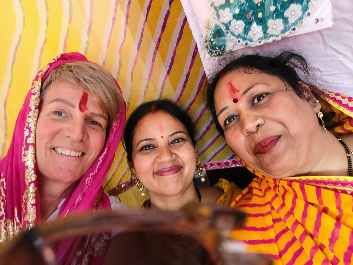 Når jeg blir iført sari i yndlingsfargen min siste kveld og får låne topp som matcher av Maharani, da insisterer Juvrai på at dette må foreviges. I ettertid veldig moro å ha, så da kom ideen om at kanskje gjestene mine, helt frivillig altså, også kunne tenke seg å foreviges i et fargerikt gevant i solnedgang oppe på City Palace. Vi får se.