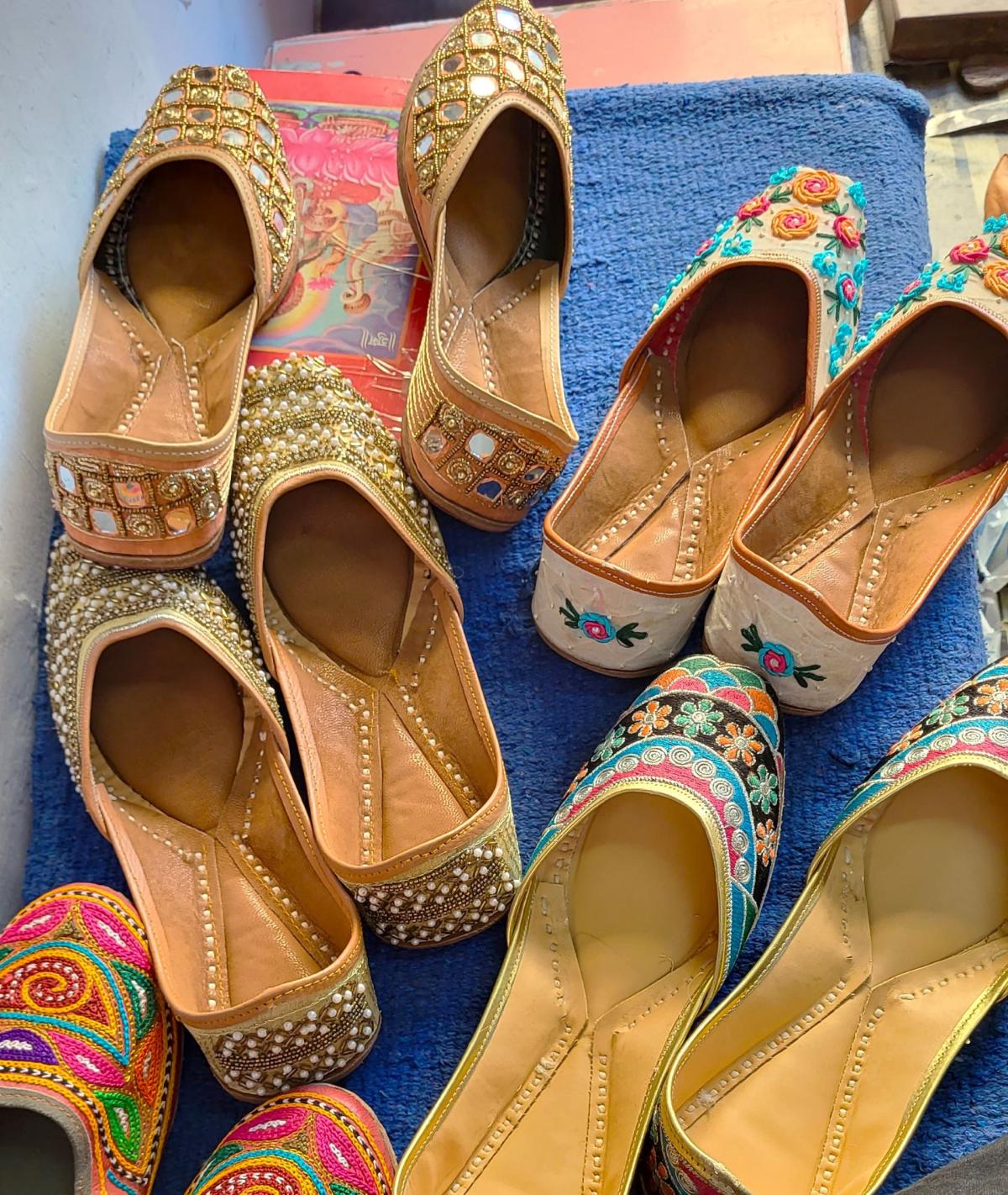 Omtrent den samme opplevelsen får jeg hos skomakeren i et annen åpning i veggen. Ny kopp te. Se og lær. Kamelskinn skjæres til etter mal for såler størrelse 38. Dobbelt sett med skinn og bomull mellom lagene. Det kobles og sys. Vips så har han et nytt skopar klart. Dekorasjonen av skoene står fruen for. Det skjer hjemme hos familien, men resultatene dekker veggene i den lille butikken. Fargerikt og lekkert. Jeg klarer ikke å velge. Det blir fem par på meg.
