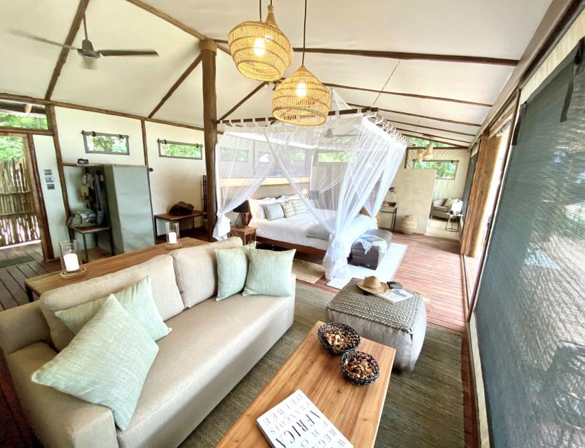 Ni luksuriøse telt byr på badekar, utvendig- og innvendig dusj, store og komfortable senger og stilig interiør. Alle teltene har spektakulær utsikt over Zambezi-elven og det rike dyrelivet som bor rett utenfor teltdøren din.