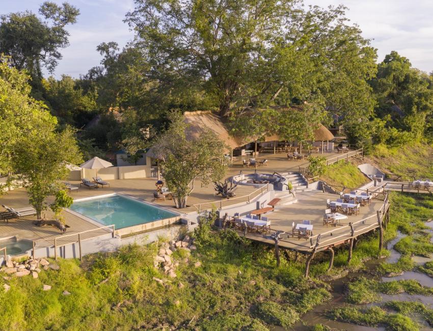 Det er en avslappet atmosfære og mange samles på verandaen ved evighetsbassenget for å ha utsikt til vannhullet og sletten mot elven.