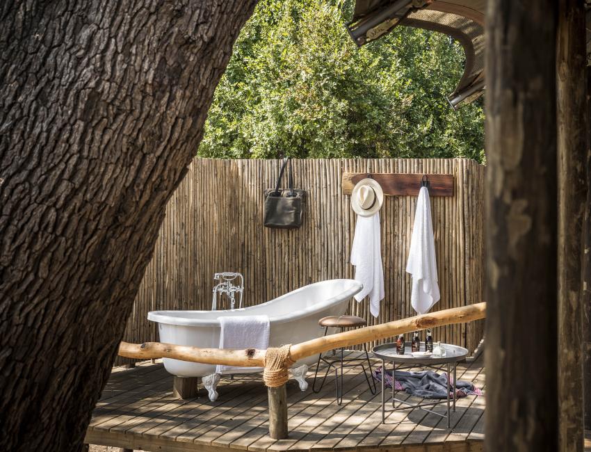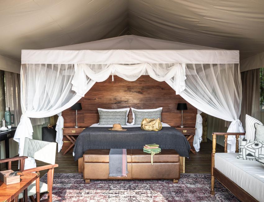 Campen har fire opphøyde telt på ca 40 kvm. Alle forbundet med stier som lar deg vandre til fellesområdene. Teltene ligger på en treplattform med egen veranda. Hvert telt har enkeltsenger som kan settes sammen til en king size seng. Innendørs bad. Utendørs badekar, en oase hvor du kan slappe av og nyte synet og lydene fra elven. Sitteplasser ute og inne. En nydelig sammensetting av hvitt sengetøy, teksturerte puter og oljete teakmøbler. Naturnære opplevelser, perfekt for eventyrlystne som søker luksus.