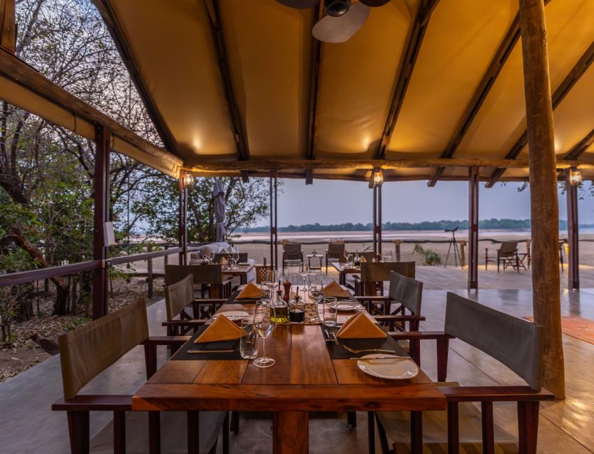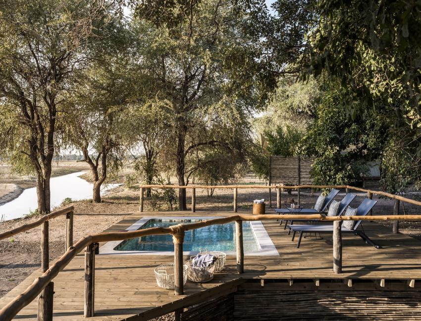 Svømmebassenget og utsiktsdekket har en vidstrakt utsikt over Luangwa-elven. Her er det uteservering, komfortable oppholdsrom og en koselig bar. Store skinnstoler, møbler i kolonistil, messingdetaljer. Sammen tar de deg med til en ekte, autentisk safari.