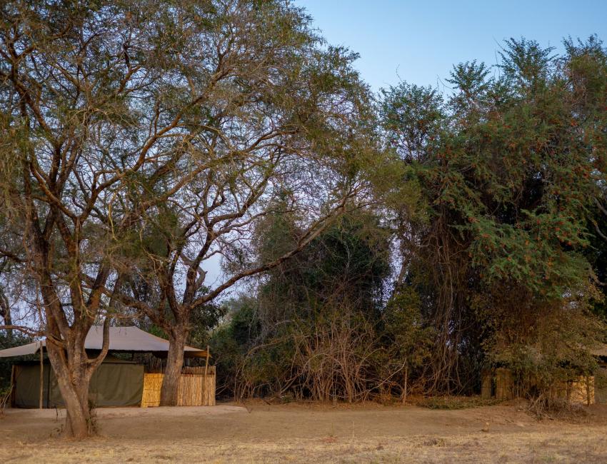 Campen er liten og intim med bare fem telt. Alle med eget bad. Hyttene er plassert i skogen langs Mwaleshi-elven – hjertet av North Luangwa nasjonalpark. Teltene er komfortable og kjølige, med alt du trenger. Dette inkluderer vannklosett og dusj i safaristil. All strømforsyning er gjennom et solcelleanlegg. Det skyggefulle hovedområdet har rikelig med overskuddsstrøm 24/7, slik at du kan holde alle enhetene dine fulladet og drikkene iskalde mens du ser ut over den dyrerike sletten foran leiren.