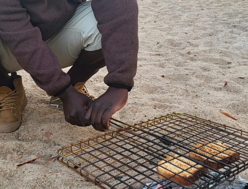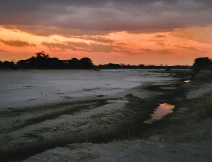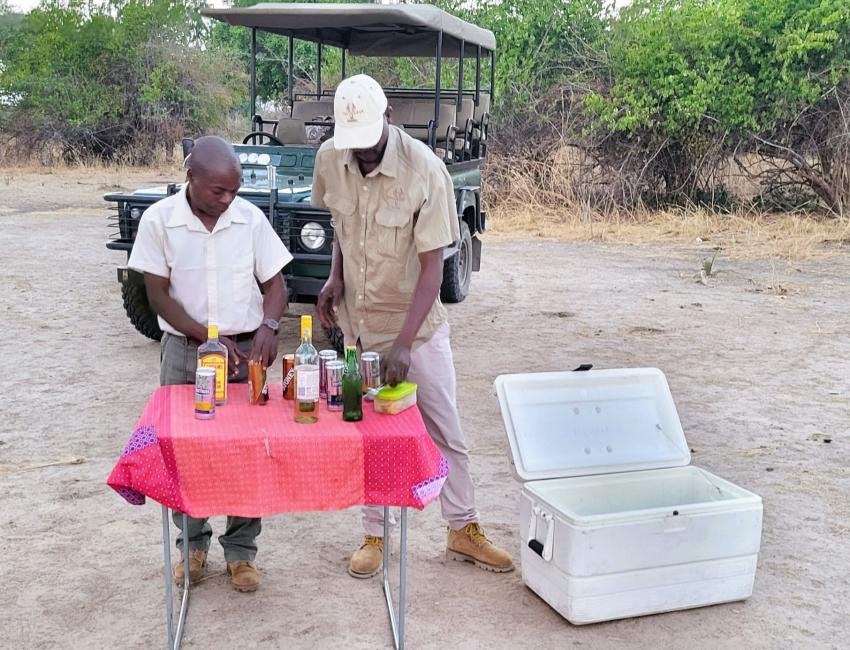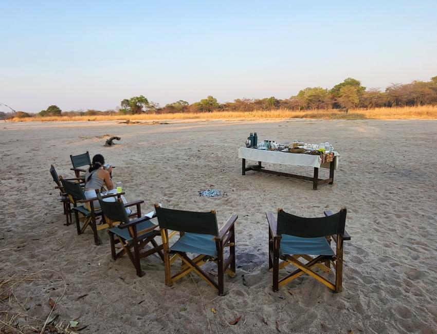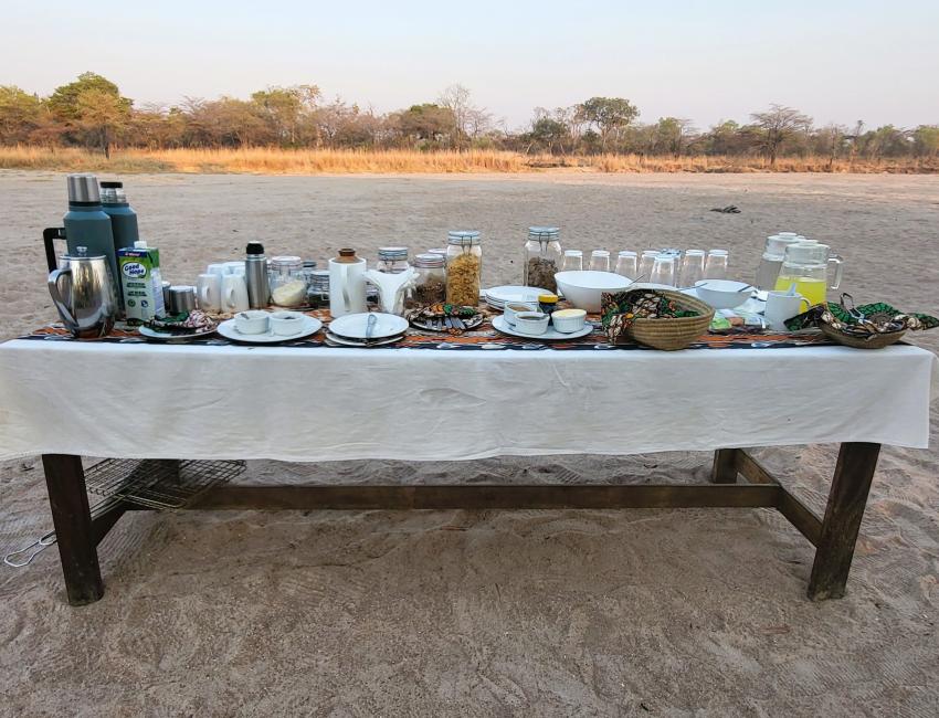 Måltidene er magiske. Frokost i sanden i den uttørkede Mushilashi-elven. Elefantene i bakgrunnen. God mat og god stemning. Dette er så tett på Out of Africa-vibber du kan komme. Middagen i sanden med lanterner og langbord sammen med Gavin og Bev. Det var faktisk nesten uvirkelig.
