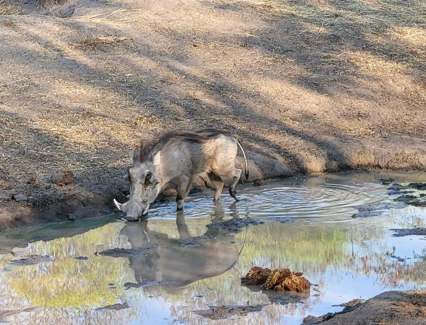 Gavin, eier og driver, tok oss med på safari til fots om morgenen. Han er genuin, ekte og ekstremt kunnskapsrik. Han ga oss eventyrlige møter med det lokale dyrelivet. Spesielt vortesvinet var en artig skrue som brøt alle regler fordi han var så tørst. Vi sto like ved han mens han slurpet i seg de livgivende dråpene.