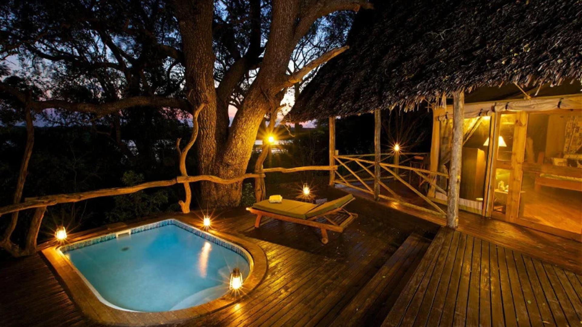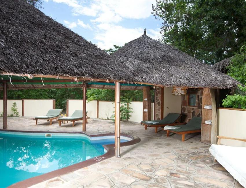 Campen er bygget av lokale håndverkere, og kombinerer palmetak med belegningsstein og treverk fra Selous. Det skyggefulle bassenget er et perfekt sted å kjøle seg ned på mellom safari-aktivitetene.