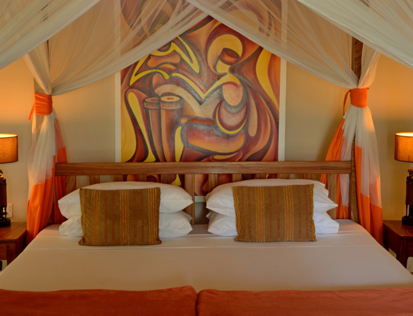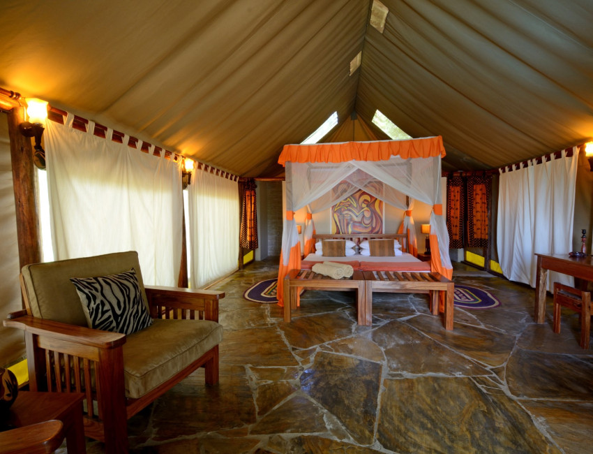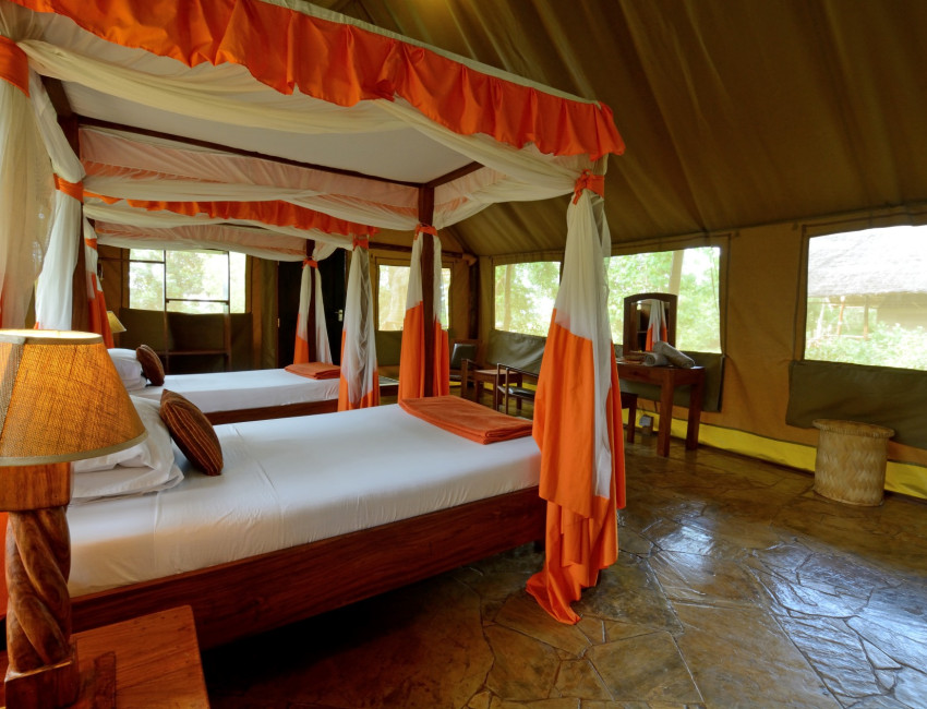 Teltene er komfortable og romslige, laget av lerret og har stråtak. De er fargerikt innredet og er plassert på en opphøyet treplatting. Eget bad med vannklosett og en romslig veranda der du har orkesterplass til dyrelivet nede ved elveleiet.