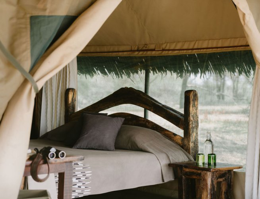 De karakteristiske safariteltene med stråtak og store vinduer med netting gir deg orkesterplass for nærkontakt med naturen.