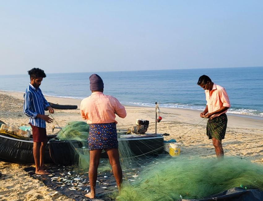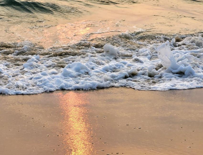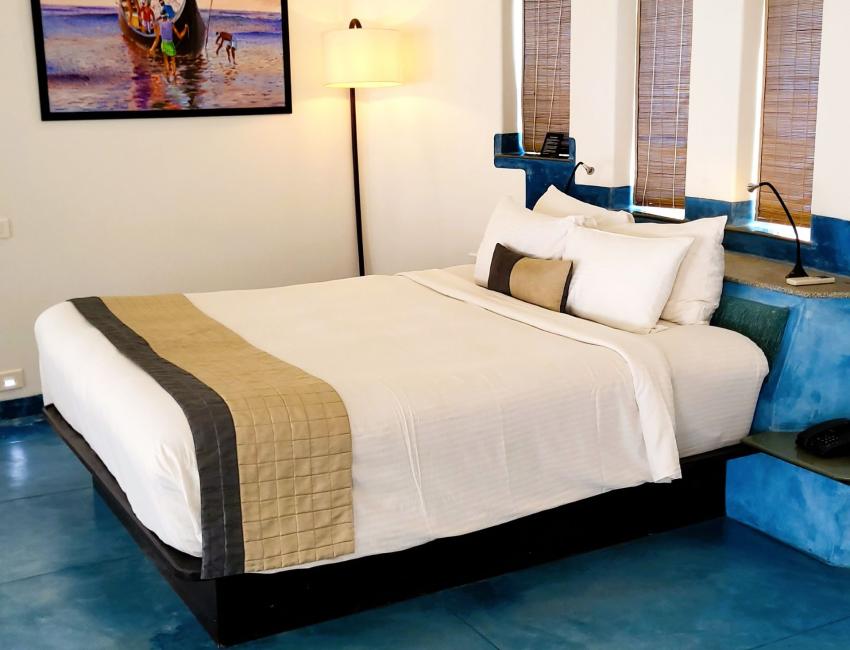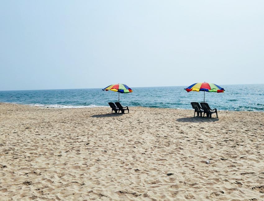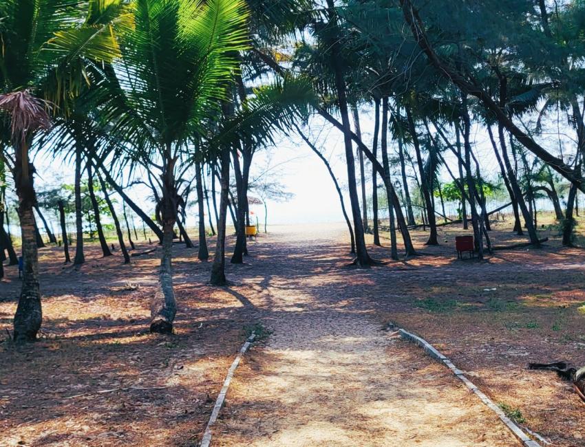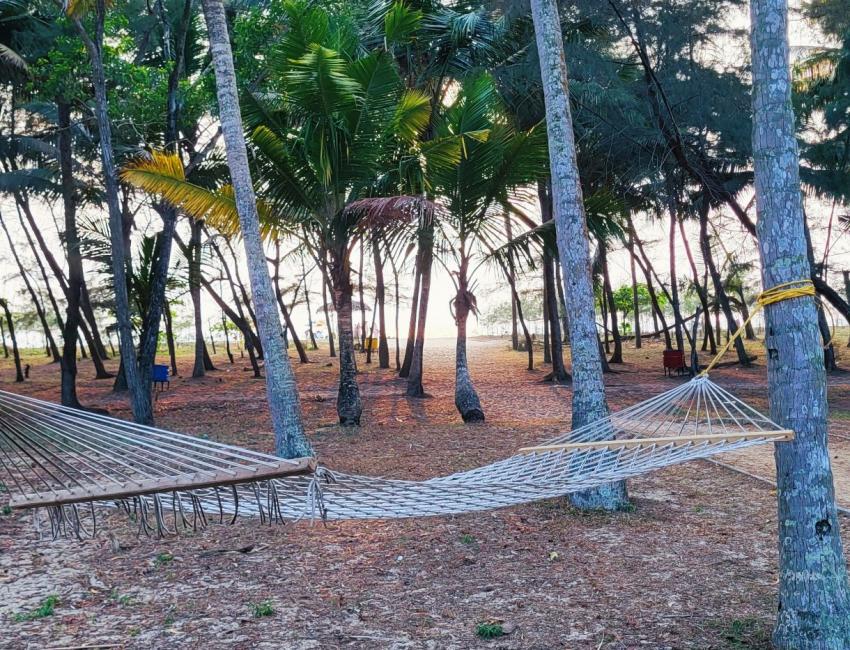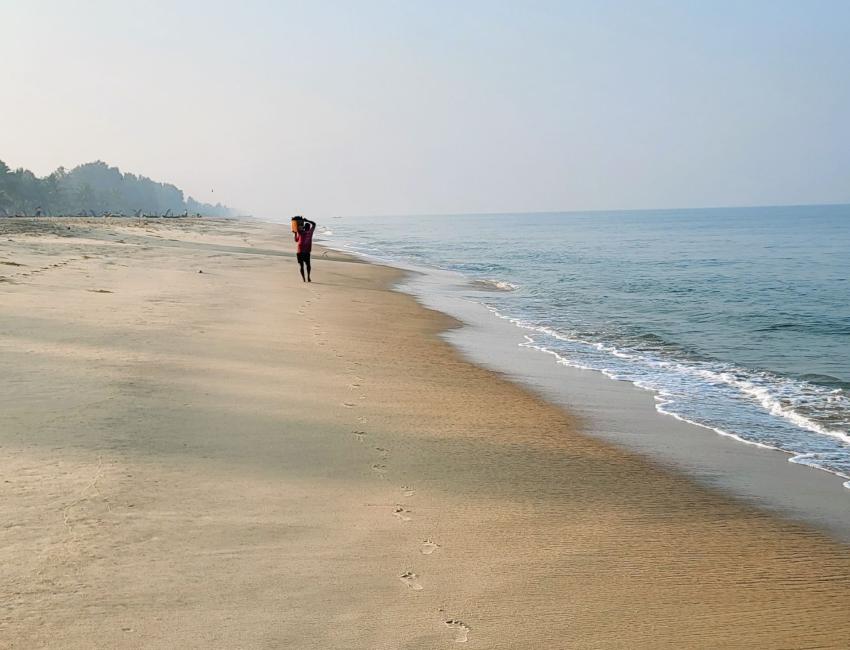 Det er ikke lov å bygge i strandkanten, så derfor er det ingen av villaene eller noe av fellesområdet som har sjøutsikt. Du må traske noen hundre meter gjennom en glissen skog av kokospalmer før du kommer ned til havet. Stranden er offentlig, men bortsett fra ved solnedgang og i helgene er det stille og rolig på stranden.