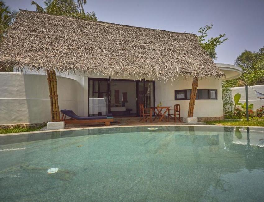Badet er halvveis utendørs (dusj ute, badekar inne) og alle villaene har hage, hengekøye, gress og sandstrand. Villaene, som har stråtak, er romslige og kjøleskapet er fylt med hjemmelagde juicer. Hagen har en buet mur som omslutter "østersen", og jeg kan love deg at det å ligge i hengekøyen om kvelden og høre kakofonien av fugler og se opp på stjernehimmelen, det er balsam for sjelen. Noen av villa-kategoriene har et lite basseng i hagen.